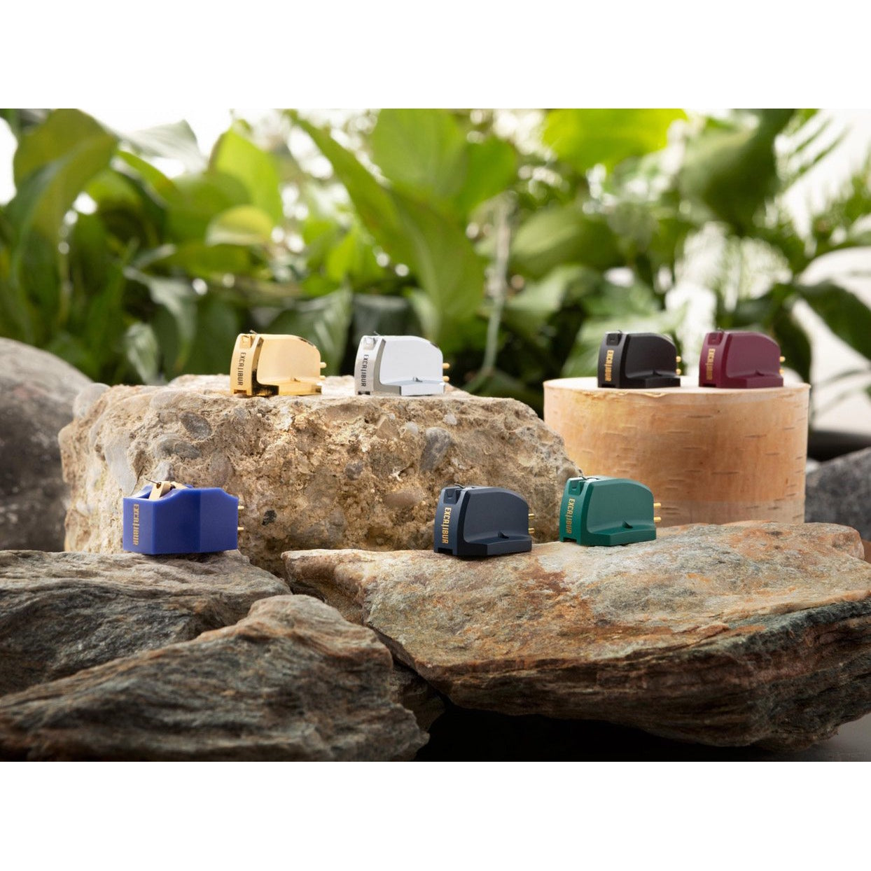 Das Gehäuse besteht aus Delrin, einem hochpräzisen technischen Kunststoff mit hoher Steifigkeit, sehr guter interner Dämpfung und niedriger Reibung. In einem Tonabnehmer bedeutet das: weniger Gehäuseresonanzen, weniger unerwünschte Rückkopplungen aus dem Tonarm, eine saubere Arbeitsumgebung für den Generator. Innen arbeitet ein fein aufgebautes Low-Output-MC mit rund 0,5 mV Ausgangsspannung, einer Innenimpedanz von etwa 7,5 Ohm und einem Frequenzgang, der weit über das für Vinyl Übliche hinausreicht – nominal 10 bis 40.000 Hz. Das ergibt ein System, das sehr leise arbeitet, aber enorm fein auflöst, wenn es an einer passenden MC-Phonostufe abgeschlossen wird.